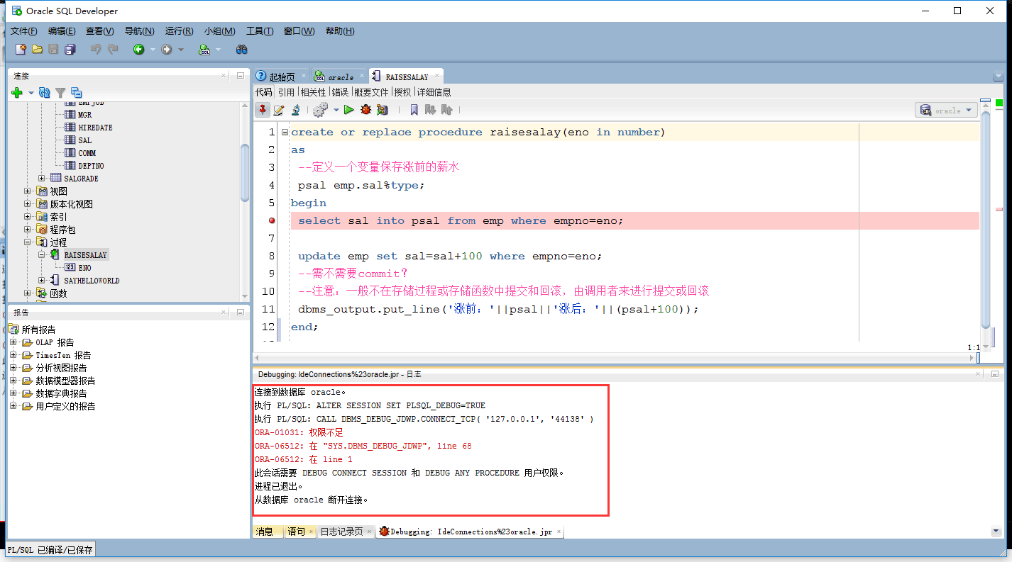SQL> show userUSER 為"SCOTT"SQL> connect system輸入口令:已連接。SQL> show userUSER 為"SYSTEM"SQL> grant DEBUG CONNECT SESSION , DEBUG ANY PROCEDURE to scott;授權成功。