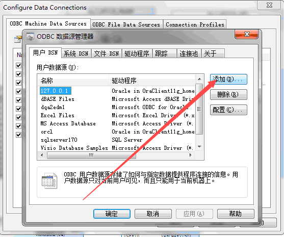 4、打開ODBC 32版本 C:/Windows/SysWOW64/odbcad32.exe,點擊添加,選擇Oracle in OracleClient_home