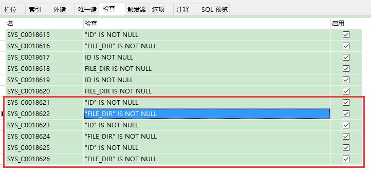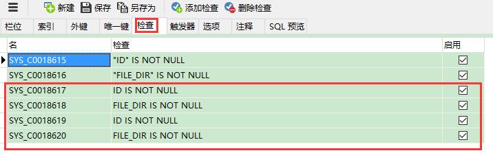 怪異之處還在于,每次執行一遍該腳本,然后導出腳本,在導出腳本中重復的次數就會增加一遍。通過navicat,最終確認每導入一次就會新增加一條重復的check約束,如下圖所示