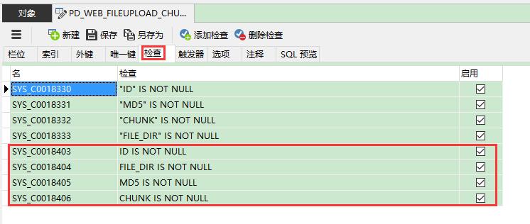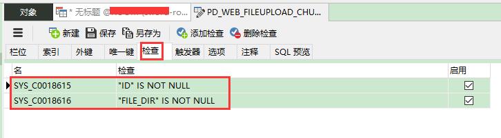 ALTER TABLE PD_WEB_FILEUPLOAD_CHUNK ADD CHECK ("ID" IS NOT NULL);ALTER TABLE PD_WEB_FILEUPLOAD_CHUNK ADD CHECK ("FILE_DIR" IS NOT NULL);結果如圖所示: