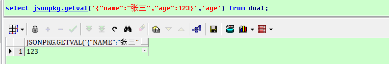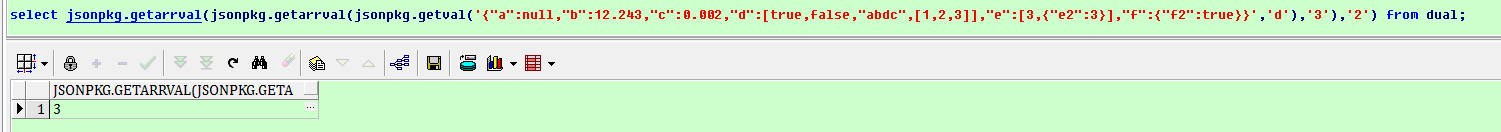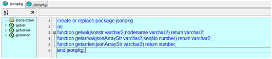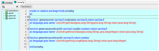 create or replace package jsonpkgasfunction getval(jsonstr varchar2,nodename varchar2) return varchar2;function getarrval(jsonArrayStr varchar2,seqNo number) return varchar2;function getarrlen(jsonArrayStr varchar2) return number;end jsonpkg;/create or replace package body jsonpkgasfunction getval(jsonstr varchar2,nodename varchar2) return varchar2as language java name 'JsonUtil.getValue(java.lang.String,java.lang.String) return java.lang.String';function getarrval(jsonArrayStr varchar2,seqNo number) return varchar2as language java name 'JsonUtil.getArrayValue(java.lang.String, java.lang.Integer) return java.lang.String';function getarrlen(jsonArrayStr varchar2) return numberas language java name 'JsonUtil.getArrayLength(java.lang.String) return java.lang.Integer';end jsonpkg;/