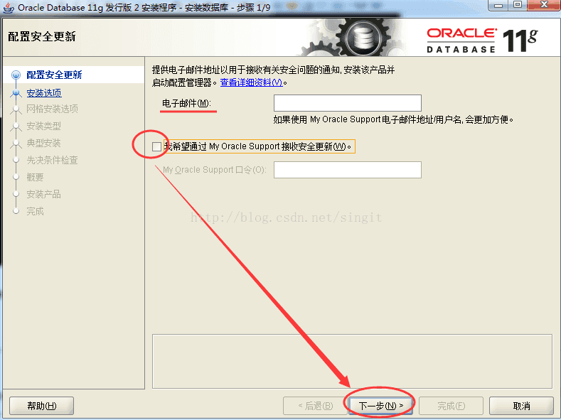 4)安裝選項:郵箱可以不填,(之后會提示你是否不希望收到安全更新的通知,點擊“是”)把更新的“√”去掉。如下圖,然后nest