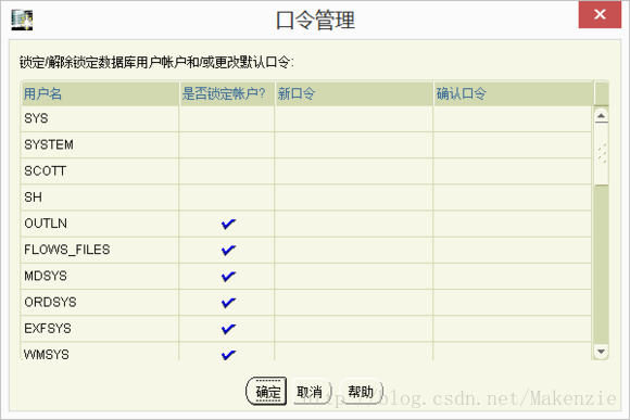 打鉤的都是鎖定,一般只留2-4個(gè)管理員用戶就好了。口令自己寫。 我在這里給用戶設(shè)置的口令都是‘oracle';