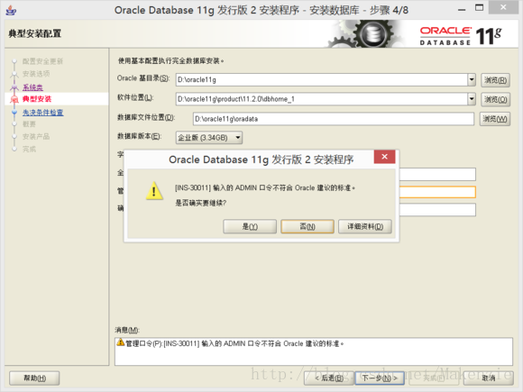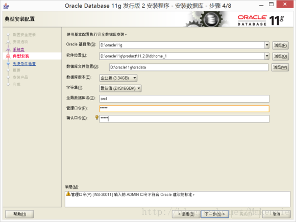路徑選擇我們之前自己創(chuàng)建的oracle11g。全局?jǐn)?shù)據(jù)庫(kù)名一般都是用的默認(rèn)的,學(xué)習(xí)用的話口令可以簡(jiǎn)單點(diǎn),不用管它的口令警告。 我在這里設(shè)置的口令是”oracle”。