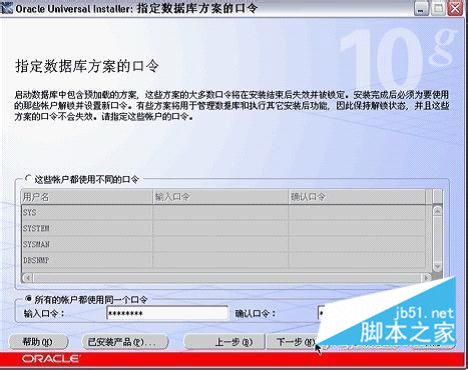 為簡化評估用數據庫的密碼設定,選擇所有的帳戶都使用同一個口令,輸入SYSTEM 等用戶的口令(口令不要以數字開頭),并按下一步按鈕
