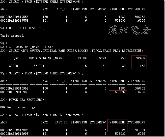 SQL> show parameter recyclebin;NAME TYPE VALUE------------------------------------ ----------- ------------------------------recyclebin string onSQL> CREATE TABLE TEST.TTT 2 AS 3 SELECT * FROM DBA_OBJECTS;Table created.SQL> COL OWNER FOR A12;SQL> COL SEGMENT_NAME FOR A32;SQL> SELECT OWNER,SEGMENT_NAME, HEADER_FILE, HEADER_BLOCK 2 FROM DBA_SEGMENTS 3 WHERE OWNER='TEST' AND SEGMENT_NAME='TTT' ;OWNER SEGMENT_NAME HEADER_FILE HEADER_BLOCK------------ -------------------------------- ----------- ------------TEST TTT 5 130SQL> SELECT * FROM X$KTFBFE WHERE KTFBFEFNO=5 ;ADDR INDX INST_ID KTFBFETSN KTFBFEFNO KTFBFEBNO KTFBFEBLKS---------------- ---------- ---------- ---------- ---------- ---------- ----------00002BA829B19558 150 1 6 5 1280 50675200002BA829B19558 151 1 6 5 508032 16256SQL> DROP TABLE TEST.TTT;Table dropped.SQL> SQL> COL ORIGINAL_NAME FOR A16;SQL> SELECT OBJ#,OWNER#,ORIGINAL_NAME,FILE#,BLOCK# ,FLAGS,SPACE FROM RECYCLEBIN$; OBJ# OWNER# ORIGINAL_NAME FILE# BLOCK# FLAGS SPACE---------- ---------- ---------------- ---------- ---------- ---------- ---------- 82820 85 TTT 5 130 30 1152SQL> SELECT * FROM X$KTFBFE WHERE KTFBFEFNO=5 ;ADDR INDX INST_ID KTFBFETSN KTFBFEFNO KTFBFEBNO KTFBFEBLKS---------------- ---------- ---------- ---------- ---------- ---------- ----------00002BA829B159D8 150 1 6 5 1280 50675200002BA829B159D8 151 1 6 5 508032 16256SQL> PURGE DBA_RECYCLEBIN;DBA Recyclebin purged.SQL> SELECT * FROM X$KTFBFE WHERE KTFBFEFNO=5 ;ADDR INDX INST_ID KTFBFETSN KTFBFEFNO KTFBFEBNO KTFBFEBLKS---------------- ---------- ---------- ---------- ---------- ---------- ----------00002BA829B159D8 150 1 6 5 128 50790400002BA829B159D8 151 1 6 5 508032 16256SQL> clip_image004