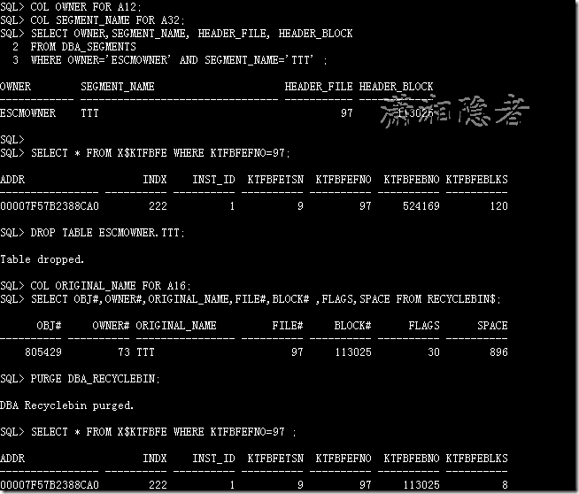 SQL> show parameter recyclebin;NAME TYPE VALUE------------------------------------ ----------- ------------------------------recyclebin string onSQL> CREATE TABLE ESCMOWNER.TTT 2 AS 3 SELECT * FROM DBA_OBJECTS;Table created.SQL> COL OWNER FOR A12;SQL> COL SEGMENT_NAME FOR A32;SQL> SELECT OWNER,SEGMENT_NAME, HEADER_FILE, HEADER_BLOCK 2 FROM DBA_SEGMENTS 3 WHERE OWNER='ESCMOWNER' AND SEGMENT_NAME='TTT' ;OWNER SEGMENT_NAME HEADER_FILE HEADER_BLOCK------------ -------------------------------- ----------- ------------ESCMOWNER TTT 97 113025SQL> SQL> SELECT * FROM X$KTFBFE WHERE KTFBFEFNO=97;ADDR INDX INST_ID KTFBFETSN KTFBFEFNO KTFBFEBNO KTFBFEBLKS---------------- ---------- ---------- ---------- ---------- ---------- ----------00007F57B2388CA0 222 1 9 97 524169 120SQL> DROP TABLE ESCMOWNER.TTT;Table dropped.SQL> COL ORIGINAL_NAME FOR A16;SQL> SELECT OBJ#,OWNER#,ORIGINAL_NAME,FILE#,BLOCK# ,FLAGS,SPACE FROM RECYCLEBIN$; OBJ# OWNER# ORIGINAL_NAME FILE# BLOCK# FLAGS SPACE---------- ---------- ---------------- ---------- ---------- ---------- ---------- 805429 73 TTT 97 113025 30 896SQL> PURGE DBA_RECYCLEBIN;DBA Recyclebin purged.SQL> SELECT * FROM X$KTFBFE WHERE KTFBFEFNO=97 ;ADDR INDX INST_ID KTFBFETSN KTFBFEFNO KTFBFEBNO KTFBFEBLKS---------------- ---------- ---------- ---------- ---------- ---------- ----------00007F57B2388CA0 222 1 9 97 113025 800007F57B2388CA0 225 1 9 97 524169 120SQL> clip_image003