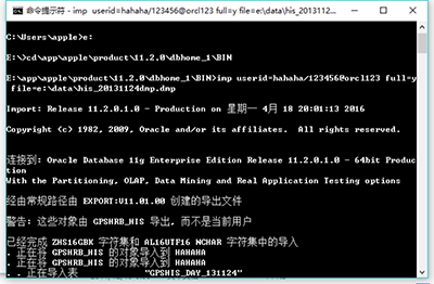 imp userid=hahaha/123456@orcl123 full=y file=e:/data/his_20131124dmp.dmp