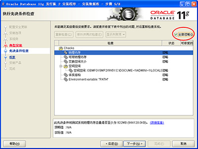 9. 先決條件檢查。 安裝程序會檢查軟硬件系統是否滿足,安裝此Oracle版本的最低要求。 直接下一步就OK 了。如圖: