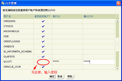 14. 解鎖scott賬戶, 去掉前面的綠色小勾,輸入密碼。同樣可以輸入平常用的短小的密碼,不必非得按oracle建議的8位以上大小寫加數字,麻煩。呵呵。如圖: