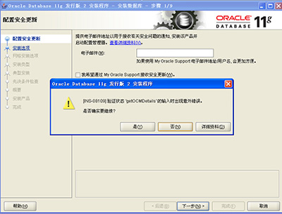 2.安裝Oracle Database 11g時出現[INS-08109] 驗證狀態 'getOCMDetails' 的輸入時出現意外錯誤怎么辦,如下圖: