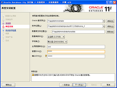 7. 典型安裝。 重要步驟。建議只需要將Oracle基目錄更新下,目錄路徑不要含有中文或其它的特殊字符。全局數據庫名可以默認,且口令密碼,必須要牢記。密碼輸入時,有提示警告,不符合Oracel建議時不用管。 (因Oracel建議的密碼規則比較麻煩, 必須是大寫字母加小寫字母加數字,而且必須是8位以上。麻煩,可以輸入平常自己習慣的短小密碼即可) 如圖: