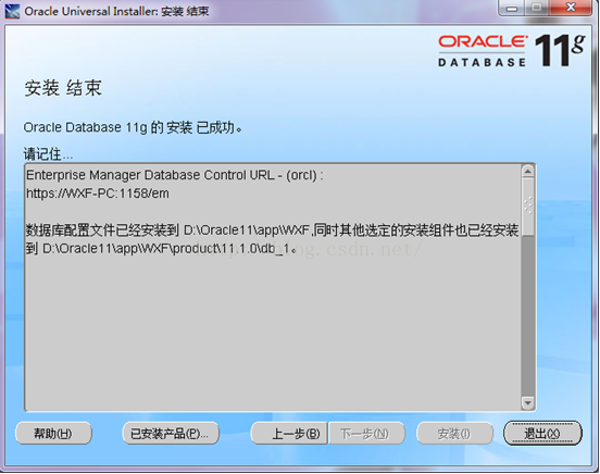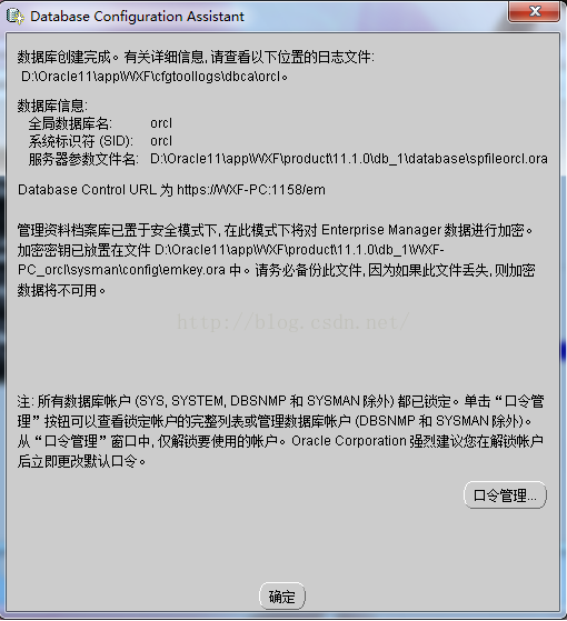 在等待Oracle數據庫創建完之后,就完成了對Oracle數據庫的安裝了,最后是Oracle的完成安裝界面:(注意你別沖動,下面一步也是很關鍵,千萬你別直接點確定了,要先點口令管理,所以啊我在這里先給你提示一下!否則你要是不點口令管理你將死的很慘。)