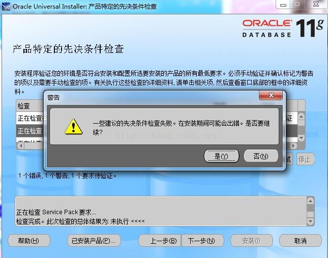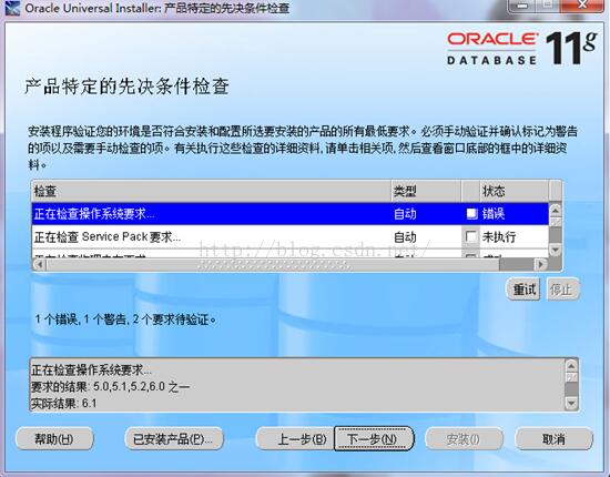 首先在自己的Windows 7旗艦版上,Oracle 11g在“產品特定的先覺條件檢查”時,提示錯誤: