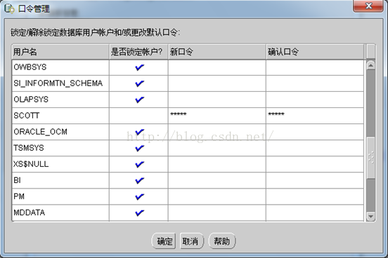 (其它的也可以設置,像system,sys先解鎖,然后設定密碼,再確認。一般這兩個密碼用test )