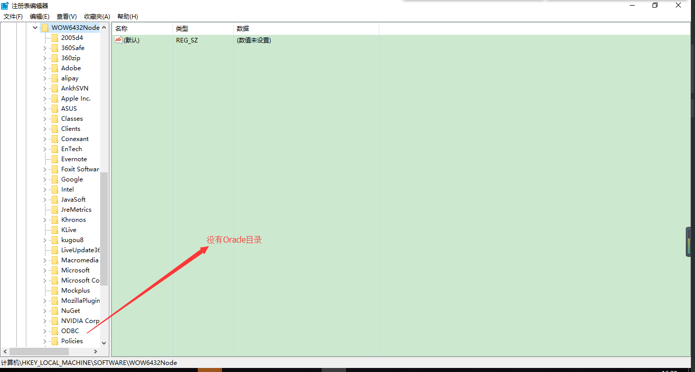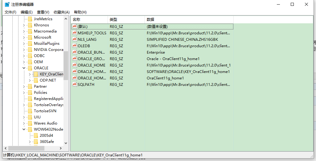 如果操作系統是32位的,那么Oracle客戶端也必定為32位,如果操作系統是64位操作系統,那么Oracle客戶端則有可能為32位或64位,我們可以通過注冊表來查看。例如,我在Windows 10上安裝了一個64位的Oracle 11g Client。 運行regedit進入注冊表系統,在HKEY_LOCAL_MACHINE/SOFTWARE/ORACLE/下面,你會發現下面沒有注冊信息,但是HKEY_LOCAL_MACHINE/SOFTWARE/Wow6432Node/ORACLE下就能看到一些詳細的注冊表信息;如果安裝的是64位的Oracle客戶端,則注冊表信息位于HKEY_LOCAL_MACHINE/SOFTWARE/ORACLE/下,而HKEY_LOCAL_MACHINE/SOFTWARE/Wow6432Node下沒有ORACLE目錄。