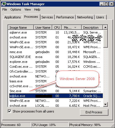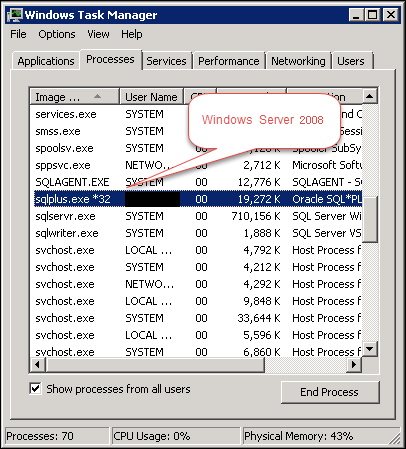 Step 2:打開任務管理器,找到SQL*Plus進程,如果Oracle的客戶端為32位,則在Image Name會標記為*32,那么如下圖所示:
