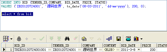 CREATE OR REPLACE TRIGGER newBid BEFORE INSERT ON BID FOR EACH ROWBEGIN IF (LENGTH("createTBNo"(:NEW.TENDER_ID)) <> 18) THEN RAISE_APPLICATION_ERROR(-20222,"createTBNo"(:NEW.TENDER_ID)); END IF; :NEW.BID_ID :="createTBNo"(:NEW.TENDER_ID);END;然后插入數(shù)據(jù)測(cè)試吧: