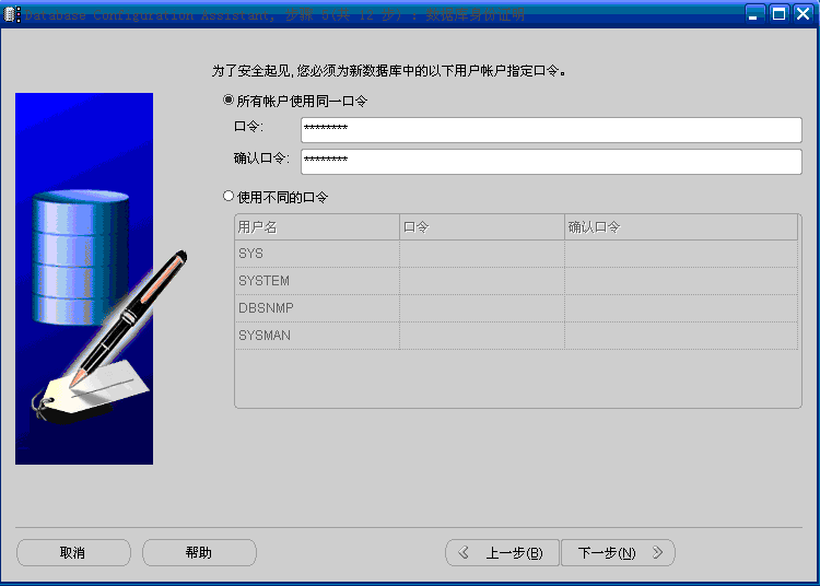 (6)單擊“下一步”按鈕,出現“數據庫身份證明”窗口,選擇“所有帳戶使用同一口令”,并輸入密碼:password,如圖6:
