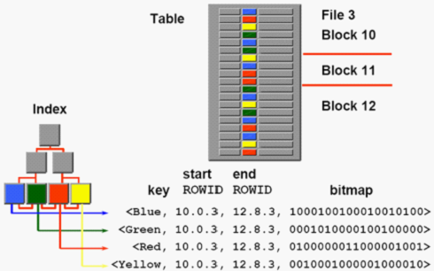 從上圖,我們可以看出,一個葉子節點(用不同顏色標識)代表一個key , start rowid 和 end rowid規定這種類型的檢索范圍,一個葉子節點標記一個唯一的bitmap值。因為一個數值類型對應一個節點,當時行查詢時,位圖索引通過不同位圖取值直接的位運算(與或),來獲取到結果集合向量(計算出的結果)。
