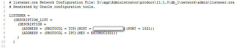 LISTENER部分配置了Oracle要監聽的地址和端口信息;該文件中還會包括SID_LIST_LISTENER部分,這部分配置了Oracle需要監聽的實例。(注:在上述截圖中并沒有SID_LIST_LISTENER這一部分,這是因為Oracle自9i版本引入了動態監聽服務注冊,在數據庫啟動時,會自動注冊當前數據庫實例到監聽列表,所以無需配置SID_LIST_LISTENER部分了)