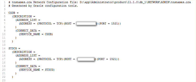 上圖中的CGDB和STDCG就是對應的TNS,HOST是指向數據庫服務器的IP,當然局域網內用計算機名稱也是可以的。通過客戶端Net Manager創建一個連接到數據庫服務器的連接服務時,實際上就是在tnsnames.ora文件中增加了一個TNS的內容。