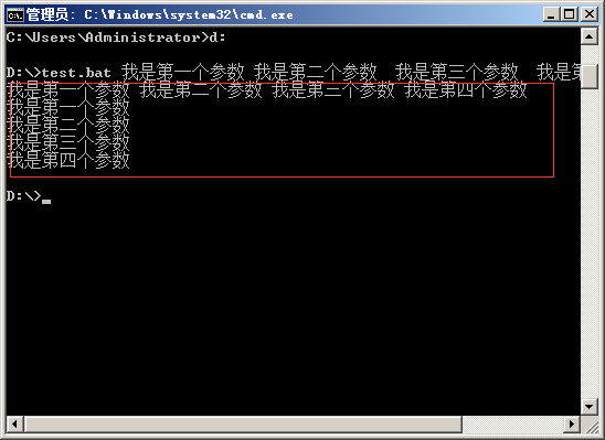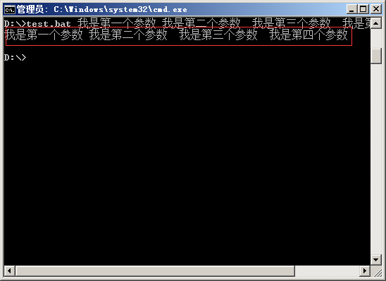 然后輸入 test.bat 我是第一個參數(shù) 我是第二個參數(shù) 我是第三個參數(shù) 我是第四個參數(shù)