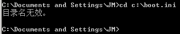 cd的全稱是Change Directory,直譯為改變文件夾,也就是跳轉目錄、切換路徑的意思。它后面可以接驅動器符號、完整路徑和相對路徑。從它的全稱可以得知,它不能操控文件,而只能作用于驅動器或文件夾。例如,我們使用 cd c:/boot.ini 這個命令來跳轉(boot.ini是文件而非文件夾),就會出現“目錄名無效”的錯誤,如下圖所示。
