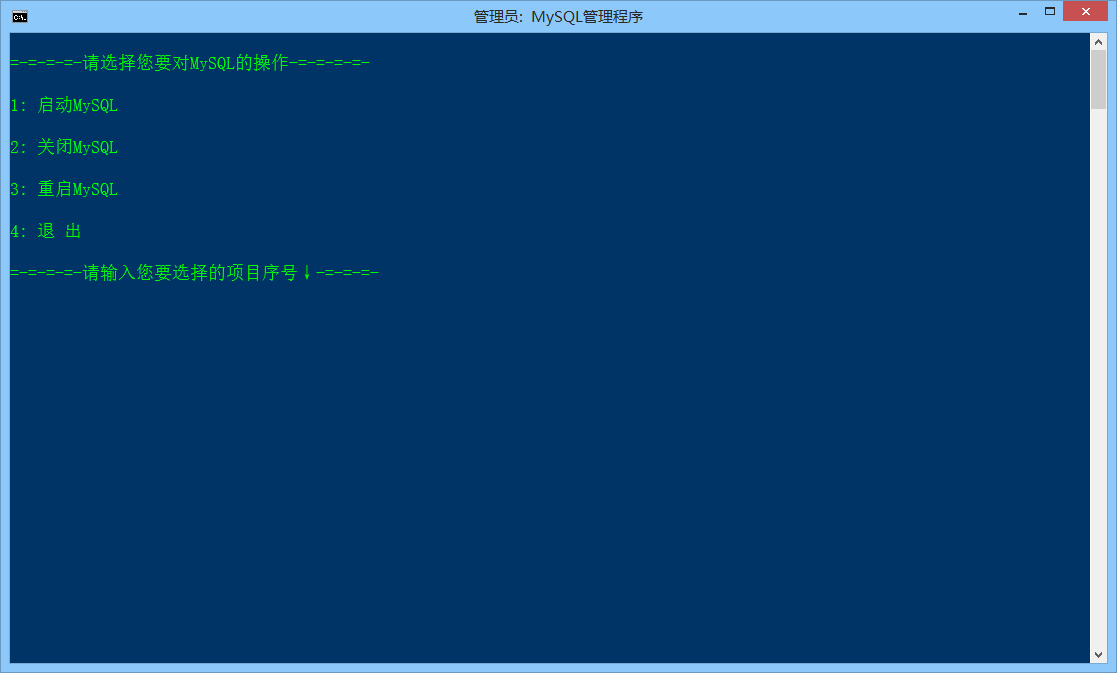 cls @echo off:設(shè)置窗口字體顏色color 0a :設(shè)置窗口標(biāo)題TITLE MySQL管理程序 call :checkAdmin goto menu:菜單:menuclsecho. echo.=-=-=-=-請選擇您要對MySQL的操作-=-=-=-=-echo.echo.1: 啟動MySQLecho.echo.2: 關(guān)閉MySQLecho. echo.3: 重啟MySQLecho. echo.4: 退 出echo.echo.=-=-=-=-請輸入您要選擇的項目序號↓-=-=-=-set /p id=if "%id%"=="1" goto startupif "%id%"=="2" goto shutdownif "%id%"=="3" goto rebootif "%id%"=="4" exitpause :啟動:startupecho.call :checkMySQL 1echo.啟動MySQL......net start "MySQL"echo.啟動MySQL成功!pause goto menu :停止:shutdownecho.call :checkMySQL 2echo.關(guān)閉MySQL......net stop "MySQL"echo.關(guān)閉MySQL成功!pause goto menu :重啟:rebootecho.call :checkMySQL 2echo.關(guān)閉MySQL......net stop "MySQL"echo.關(guān)閉MySQL成功!goto startupgoto menu :退出:gooutpausegoto menu :檢查MySQL進(jìn)程是否存在:checkMySQLset /a count=0for /f "tokens=1 delims= " %%i in ('tasklist /nh ^| find /i "MySQL"') do (set /a count+=1)if %count% neq 0 if "%1" equ "1" ( echo 警告:MySQL已啟動 goto goout)if %count% equ 0 if "%1" equ "2" ( echo 警告:MySQL未啟動 goto goout) :檢查是否是以管理員身份運行:checkAdminecho test am i admin? > %SystemRoot%/System32/test.sunhaoif not exist %SystemRoot%/System32/test.sunhao ( echo 警告:請以管理員身份運行! pause exit)del %SystemRoot%/System32/test.sunhao