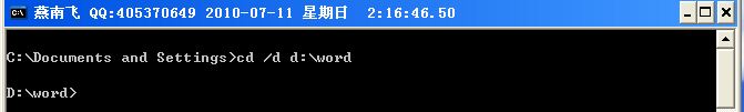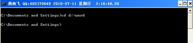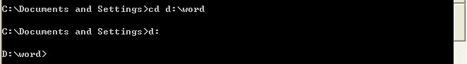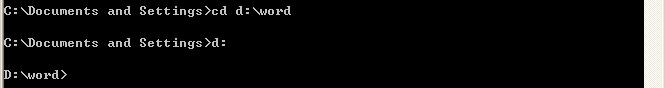 例7、如果當前目錄是C:/Documents and Settings 要切換到 d:/word 在命令行輸入cd d:/word回車后再輸入d: 如下圖