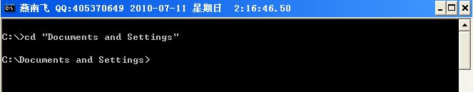 例3、如果想進入下一層目錄,在當前命令提示符下輸入cd 目錄名。在命令提示符C:/>下輸入cd “documents and setting”如下圖: