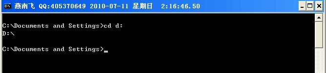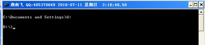 例4、如果想改變當前驅動器的目錄c:/documents and settings,進入到d驅動器默認目錄,在當前命令行輸入d: 執行后結果如下圖