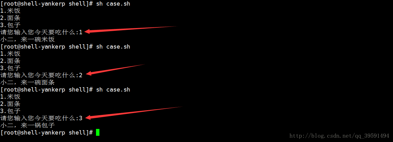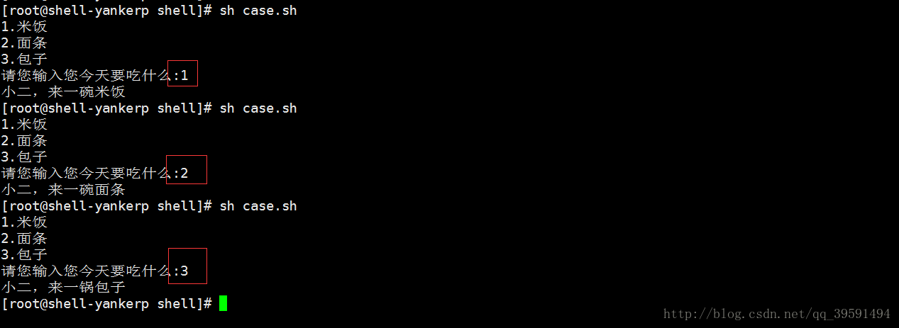 #!/bin/bash #!/bin/bash # Date: 4:42 2018-2-5 # Mail: ywyankerp@163.com # Founder: <YanKai> # Describe: This is a one - button installation service script function CDAN(){ #定義一個CDAN的函數 cat << yankerp 1.米飯 2.面條 3.包子 yankerp } CDAN #調用CDAN函數 read -p 請您輸入您今天要吃什么: NUM #輸入一條提示,然后把用戶輸入的字符串賦值給變量NUM expr $NUM + 1 &>/dev/null # 使用數值運算命令expr來確定用戶輸入的是否是數值 if [ "$?" -ne 0 ] #如果用戶輸入的不是數值 then #那么 echo "請您輸入{1|2|3}" #打印出 1 2 3 exit 1 #最后退出腳本 fi #結束if語句 case $NUM in #這里就是我們的case語句了,簡單理解,在NUM這個變量中 1) #如果用戶輸入的是1 echo "小二,來一碗米飯" #那么就輸出一行來一碗米飯 ;; 2) #如果在NUM變量中用戶輸入的是2 echo "小二,來一碗面條" #那么繼續打印此內容 ;; 3) #以此類推 echo "小二,來一鍋包子" ;; esac #最后使用esac結束 覺得不夠養眼?沒有關系如下圖: