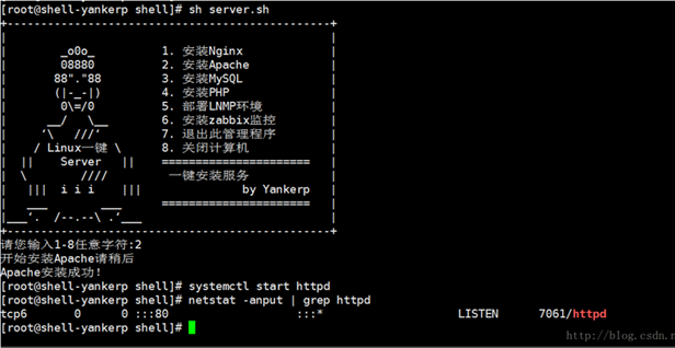 #!/bin/bash # Date: 4:42 2018-2-5 # Mail: ywyankerp@163.com # Founder: <YanKai> # Describe: This is a one - button installation service script function CDAN(){ cat << yankerp +------------------------------------------------+ | | | _o0o_ 1. 安裝Nginx | | 08880 2. 安裝Apache | | 88"."88 3. 安裝MySQL | | (|-_-|) 4. 安裝PHP | | 0/=/0 5. 部署LNMP環境 | | __/ /__ 6. 安裝zabbix監控 | | ‘/ ///‘ 7. 退出此管理程序 | | / Linux一鍵 / 8. 關閉計算機 | | || Server || ====================== | | / //// 一鍵安裝服務 | | ||| i i i ||| by Yankerp | | ___ ___ ====================== | |___‘. /--.--/ .‘___ | +------------------------------------------------+ yankerp } CDAN . /etc/init.d/functions BASE_DIR=/usr/local/src read -p "請您輸入1-8任意字符:" NUM expr $NUM + 1 &>/dev/null if [ "$?" -ne 0 ] then echo "請您輸入{1|2|3|4|5|6|7|8}" exit 1 fi function Nginx_server (){ echo "開始安裝Nginx請稍后...." yum install -y gcc gcc-c++ pcre-devel zlib-devel openssl-devel &>/dev/null cd $BASE_DIR && wget http://nginx.org/download/nginx-1.12.2.tar.gz &>/dev/null && useradd -M -s /sbin/nologin nginx && / tar zxf nginx-1.12.2.tar.gz && cd $BASE_DIR/nginx-1.12.2/ && / ./configure --prefix=/usr/local/nginx --with-http_dav_module--with-http_stub_status_module --with-http_addition_module --with-http_sub_module --with-http_flv_module --with-http_mp4_module--with-pcre --with-http_ssl_module --with-http_gzip_static_module --user=nginx --group=nginx &>/dev/null if [ "$?" -eq 0 ] then make && make install &>/dev/null fi if [ -f /usr/local/nginx/sbin/nginx ];then ln -s /usr/local/nginx/sbin/nginx /usr/local/sbin && nginx && echo "Nginx安裝成功!" fi } function Apache_server (){ echo "開始安裝Apache請稍后" yum install httpd -y &>/dev/null if [ "$?" -eq 0 ] then echo "Apache安裝成功!" else echo "Apache安裝失??!" fi } case $NUM in 1) Nginx_server ;; 2) Apache_server ;; esac 運行結果如下: