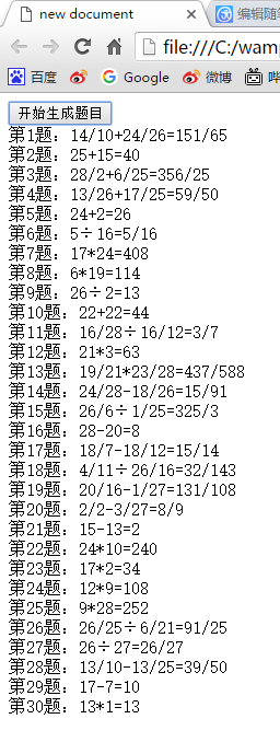<!DOCTYPE html PUBLIC "-//W3C//DTD XHTML 1.0 Transitional//EN" "http://www.w3.org/TR/xhtml1/DTD/xhtml1-transitional.dtd"><html xmlns="http://www.w3.org/1999/xhtml"> <head> <title> new document </title> <meta http-equiv="Content-Type" content="text/html; charset=utf-8"> <meta name="generator" content="editplus" /> <meta name="author" content="" /> <meta name="keywords" content="" /> <meta name="description" content="" /> </head> <body> <button type='button' onclick="play_all()">開始生成題目</button> <span id="text"></span> </body> <script> function GetRandomNum(Min,Max) { var Range = Max - Min; var Rand = Math.random(); return(Min + Math.round(Rand * Range)); } function max_num(x,y) { var t; while (y) { t = x%y; x = y; y = t; } return x; } function fenshu(a,b,p) { if (p==1) { if (a>b) { return a+"/"+b; }else if(a<b){ return a+"/"+b; }else { return 1; } }else { var x=a/p; var y=b/p; if(y==1){ return x; }else{ return x+"/"+y; } } } function f_count(a,b,c,d) { var Arr = ["+","-","*","/"]; var n = GetRandomNum(0,3); switch(Arr[n]){ case "+":{ var sum_x=(a*d)+(b*c); var sum_y=b*d; max_x=max_num(sum_x,sum_y); max_y=max_num(sum_x,sum_y); var N=fenshu(sum_x,sum_y,max_x); return a+"/"+b+"+"+c+"/"+d+"="+N; break; } case "-":{ var sum_x=(a*d)-(b*c); while (sum_x<0) { var a = GetRandomNum(1,30); var b = GetRandomNum(1,30); var c = GetRandomNum(1,30); var d = GetRandomNum(1,30); var sum_x=(a*d)-(b*c); } var sum_y=b*d; max_x=max_num(sum_x,sum_y); max_y=max_num(sum_x,sum_y); var N=fenshu(sum_x,sum_y,max_x); return a+"/"+b+"-"+c+"/"+d+"="+N; break; } case "*":{ var sum_x=a*c; var sum_y=b*d; max_x=max_num(sum_x,sum_y); max_y=max_num(sum_x,sum_y); var N=fenshu(sum_x,sum_y,max_x); return a+"/"+b+"*"+c+"/"+d+"="+N; break; } case "/":{ var sum_x=a*d; var sum_y=b*c; max_x=max_num(sum_x,sum_y); max_y=max_num(sum_x,sum_y); var N=fenshu(sum_x,sum_y,max_x); return a+"/"+b+"÷"+c+"/"+d+"="+N; break; } } } function count(a,b){ var Arr = ["+","-","*","/"]; var n = GetRandomNum(0,3); switch(Arr[n]){ case "+":{ var sum=a+b; return a+"+"+b+"="+sum; break; } case "-":{ var sum=a-b; while(sum<0){ var a = GetRandomNum(1,30); var b = GetRandomNum(1,30); var sum=a-b; } return a+"-"+b+"="+sum; break; } case "*":{ var sum=a*b; return a+"*"+b+"="+sum; break; } case "/":{ var sum=a/b; while(a%b!==0){ var max_x=max_num(a,b); var N=fenshu(a,b,max_x); return a+"÷"+b+"="+N; } return a+"÷"+b+"="+sum; break; } } } function pl_f() { var son_a = GetRandomNum(1,30); var par_b = GetRandomNum(1,30); var son_c = GetRandomNum(1,30); var par_d = GetRandomNum(1,30); var suma=f_count(son_a,par_b,son_c,par_d); return suma; } function pl() { var a = GetRandomNum(1,30); var b = GetRandomNum(1,30); var sumb=count(a,b); return sumb; } function play_all() { for (i = 1; i <=30; i++) { var a = GetRandomNum(0,1); document.getElementById("text").innerHTML+=("<br>"+"第"+i+"題:"); switch (a) { case 0: var A=pl(); document.getElementById("text").innerHTML+=(A); break; case 1: var B=pl_f(); document.getElementById("text").innerHTML+=(B); break; } } } </script></html>執行完節目就成這樣的啦