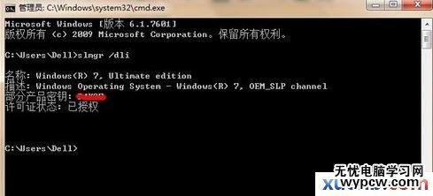 2.輸入cmd回車,繼續輸入slmgr.vbs /dli回車,即可看到windows7的版本、密鑰和許可證狀態,如圖