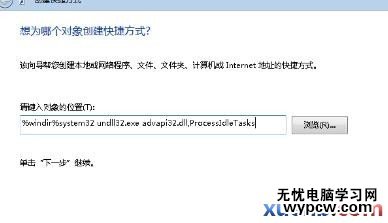 2、然后在彈出來的創建快捷方式的窗口中,在“請鍵入對象的位置”中把下面的代碼復制粘貼進去;