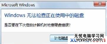 小提示:如果當前磁盤正在使用中,則無法進行磁盤錯誤檢查。此時會彈出提示框,單擊“計劃磁盤檢查”按鈕,系統將在下次啟動時自動進行磁盤檢查。