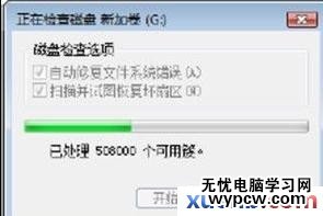 第3步:在彈出的“檢查磁盤”對話框中勾選“自動修復文件系統錯誤”和“掃描并試圖恢復壞扇區”復選框,然后單擊“開始”按鈕。