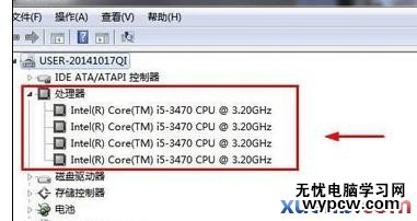 由我的電腦→屬性→設備管理器可以清楚地看到CPU的數目,從圖中可以看出CPU為四核。