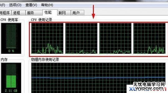 打開任務管理器,選擇性能選項,可以查看CPU的運行使用記錄,圖中可以看出四核。