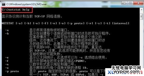 在C盤根目錄下輸入“netstat help”后按【Enter】鍵,查看關于netstat命令參數的詳細說明