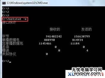在C盤根目錄下輸入“netstat -n”后按【Enter】鍵,查看關于以太網的統計數據