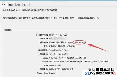 3在出來的DirectX診斷工具下面找到操作系統(tǒng),那個操作系統(tǒng)最后面就有一個版本。這個版本就是想要的那個版本號。