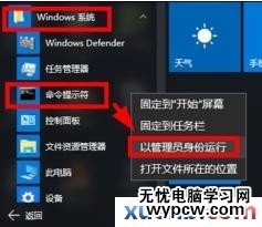 所有應用中,我們在Windows系統中找到命令提示符,然后這時候在命令提示符上單擊鼠標右鍵,選擇以管理員身份打開命令提示符。