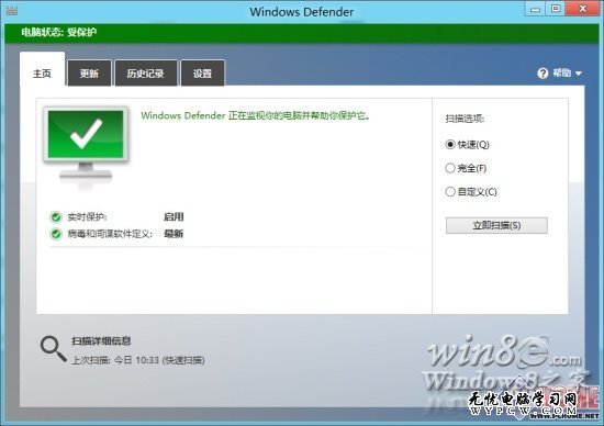 Windows 8里的Defender已經(jīng)具備完整的實(shí)時(shí)反病毒和反惡意軟件功能,而它實(shí)質(zhì)上就是微軟的免費(fèi)安全軟件MSE.也就是說(shuō)即使用戶忘了安裝殺毒軟件,采用Windows 8提供的內(nèi)置安全軟件也可以滿足一般需要。