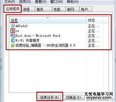 在任務管理器窗口下,“應用程序”欄,選擇你要結束的任務(選的是讓你的電腦死機的任務),然后點擊“結束任務”。