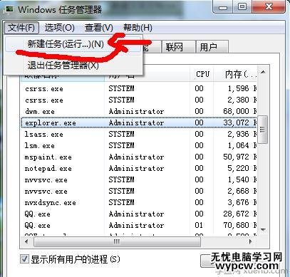 explorer.exe進程結束后,除了任務管理器還在屏幕上以外,桌面上的東西都會消失。這是在任務管理上邊左上角點擊文件---點擊“新建任務”。