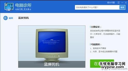 2,打開了電腦診所之后,點擊右上角的搜索窗口,然后在里面搜索【藍屏死機】,然后根據提示逐步進行操作,就可以幫你順利解決問題了。