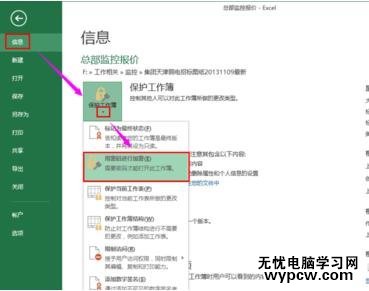 加密步驟2:在“信息”選項中,點擊“保護(hù)工作簿”的下拉菜單,選擇菜單中的“用密碼進(jìn)行加密”